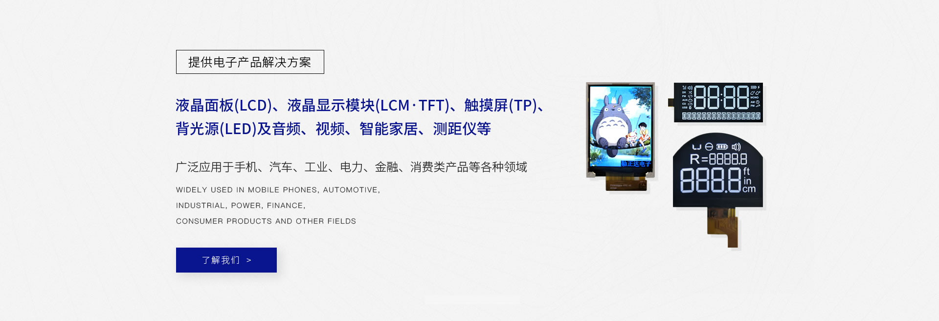 專業設計、生產液晶面板(LCD)、液晶顯示模塊(LCM·TFT)、觸摸屏(TP)、背光源(LED)及音頻、視頻、智能家居、測距儀等